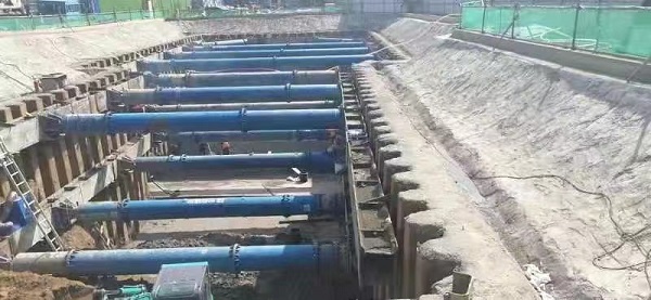 施工中,项目部采取分段施工方式,待底板混凝土强度达到100%后,拆除第二道支撑,进行第一步主体施工,回填素土并压实;待混凝土强度达到100%后,拆除第一道支撑,继续第二步主体施工,争取在主汛期到来时完成第一步3.8米施工并回填,将基坑坍塌风险降到最低。由于地下水位上涨较快,沿坑底外围等间距设置降水井,24小时不间断降水,保证降水稳定。施工班组连续奋战,管理人员旁站监督,钢筋绑扎、模板支设、砼浇筑各工序有条不紊,模板拆除验收合格后,昼夜不停进行隐蔽回填,最终,第一步3.8米于汛期到来前回填完成。